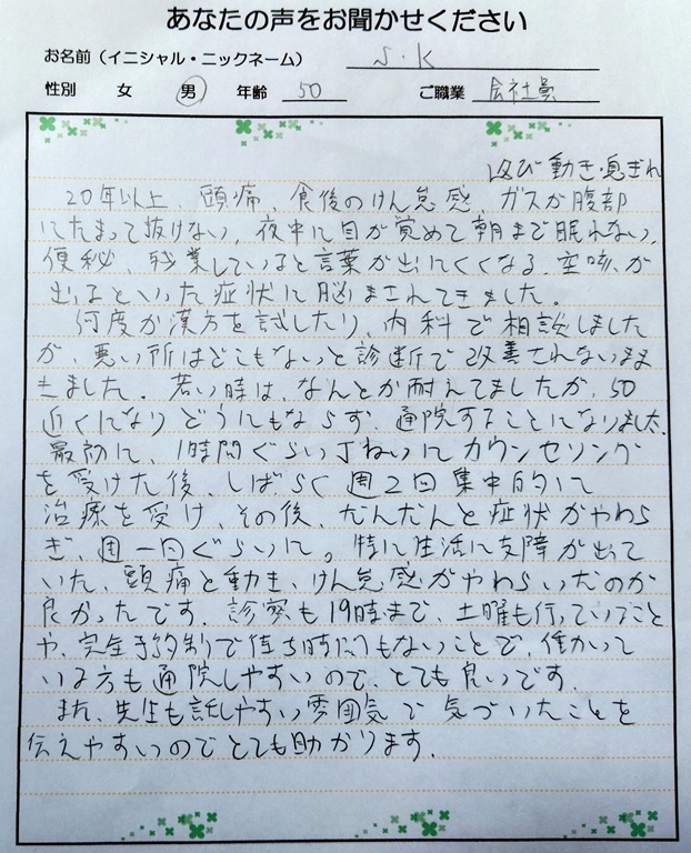 先生に問診・体の状態をていねいに見ていただき、はり・お灸の治療をしていただき、また家でのお灸場所のアドバイスをしてもらい、徐々に良くなりました。